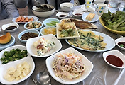 김치, 마카로니샐러드, 파채, 상추, 콩나물 무침 등이 있었습니다.