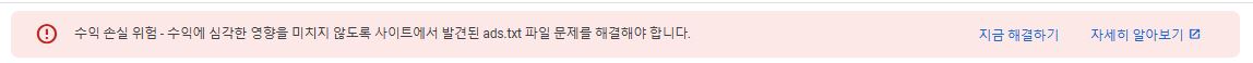 구글 애드센스를 티스토리에 연동하여 사용중에 아래와 같은 '수익손실위험' 경고창을 보게 되었습니다.