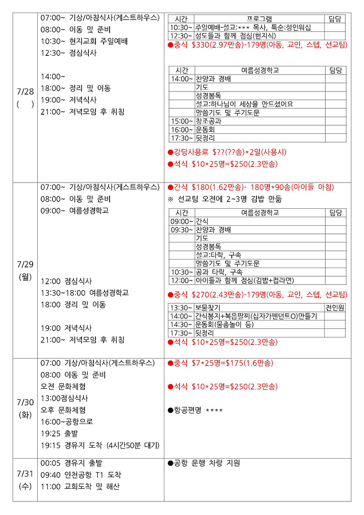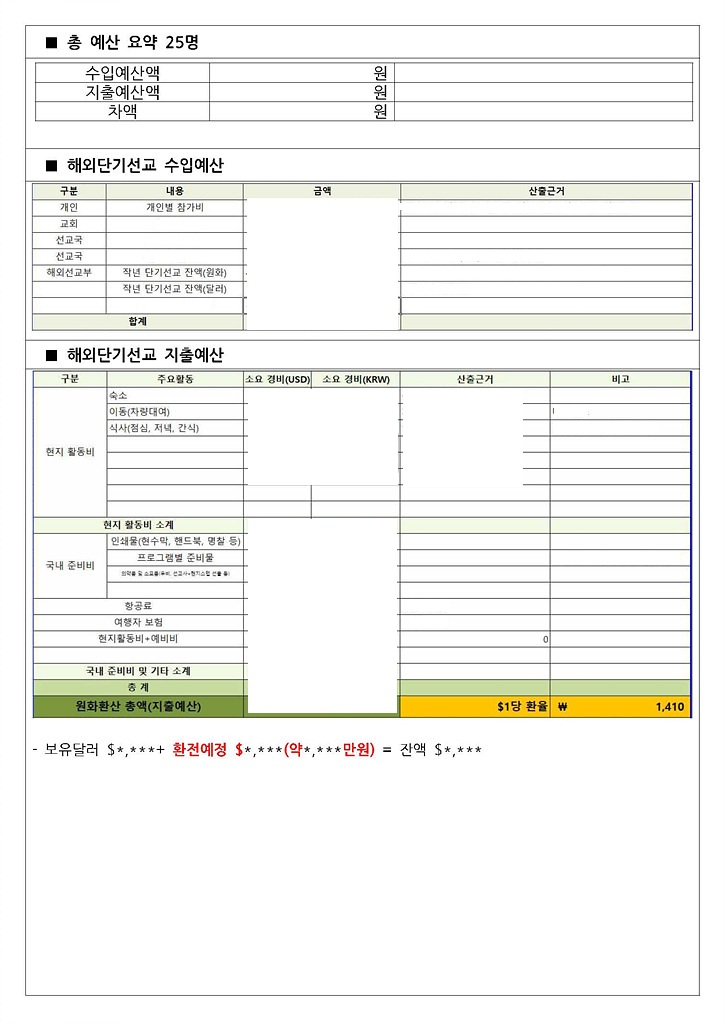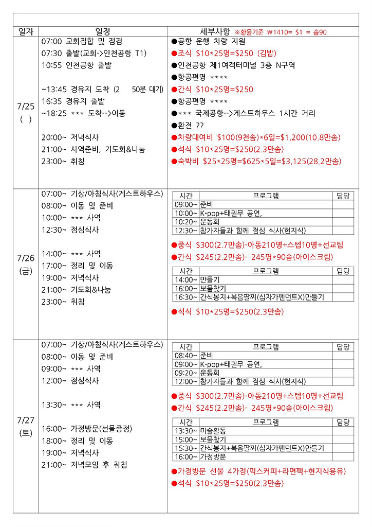세부 일정에 따른 지출내역을 계획해야 합니다. 여기서 정말 많이 복잡해지는데 화폐가 나라별로 달라 이중환전(??)으로 계산해야 되기 때문입니다. 계산에 익숙하신 분이 선교팀에 계신다면 정말 축복 받으신겁니다.