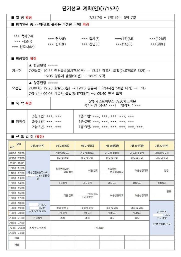 미성년자 단기선교팀의 경우 부모들과 정보교류가 중요합니다. 청소년 시기 아이들이 부모에게 설명을 잘 안해주거든요. 가정통신문을 통해 어떤 일정으로 어떤 곳을 가며 무슨일을 하고 어떤 환경에서 지낼지 알려드립니다. 부모 단톡방을 통해 아이들이 어떤 준비를 하고, 선교지에서 어떻게 지내고 있는지 공유해주어야 부모의 걱정을 덜 수 있습니다.