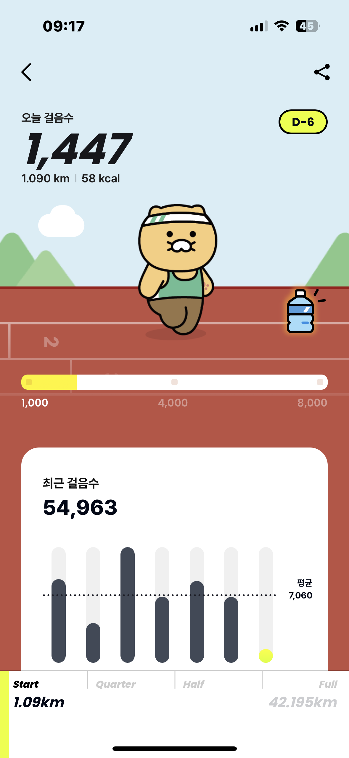 오른쪽 가운데 보시면 목표 걸음수가 되면 물병이나 고구마가 반짝거릴텐데