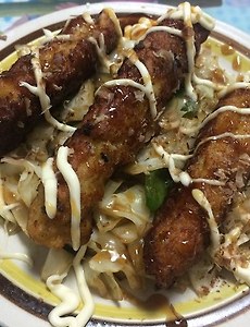 솔직히 잘 못 만들어서 맛이 없었던 오징어 어묵 오징어랑 야채만 갈아서 넣을껄 전분이랑 빵가루랑 첨가해서 별루 맛이 없었어요 ㅋ 재료는 오징어, 양파, 당근, 피망, 전분가루, 빵가루, 소금 후추 양배추, 굴소스, 마요네즈, 데리야끼소스, 가쯔오브시 믹서에 넣고 싹 갈아줍니다. 갈면 이모양이 되는데 약간 질게 만드시는게 좋습니다. 도마에 쭉 펴고 살살 말아줍니다. 생각보다 안 어렵더라구요.. 열 오른 기름에 튀겨주는데 약한 불에 튀겨야 속까지 익습니다. 전 불이 세서 겉이 탔어요 ㅠㅠ 그사이에 같이 먹을 채소를 볶아 줍니다. 센불에 쏵 볶고 굴소스 한스푼 정도만 같이 넣고 볶습니다. 접시에 채소를 깔고 그 위에 어묵을 올린뒤 마요네즈 데리야끼 소스를 뿌려주고 가쯔오브시를 올려주면 끝.
